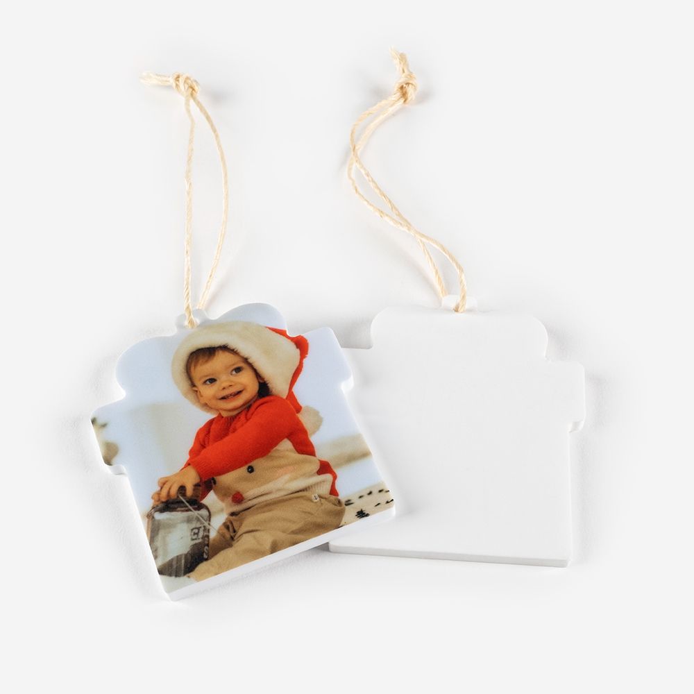O enfeite tem um acabamento branco no verso, realçando a impressão e conferindo-lhe um toque sofisticado. Acompanha ainda um cordel para pendurar na árvore.